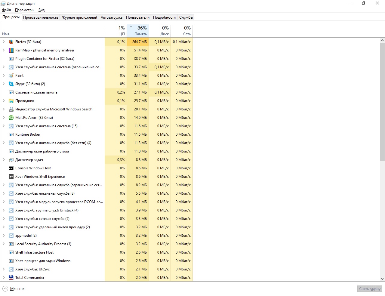 За день работы приходится несколько раз перегружаться, потому что система становится неработоспособной, все дико тормозит и виснет. Куда-то уходит память. Особенно это заметно при долгом серфинге в браузере или копировании из сети больших файлов. Ощущение по графику потребления памяти, что они пишутся прям в ОЗУ, но при окончании процесса копирования память не очищается. ОС - Win 10 Pro Версия 1511 Сборка 10586.420 Помогите разобраться с проблемой. |