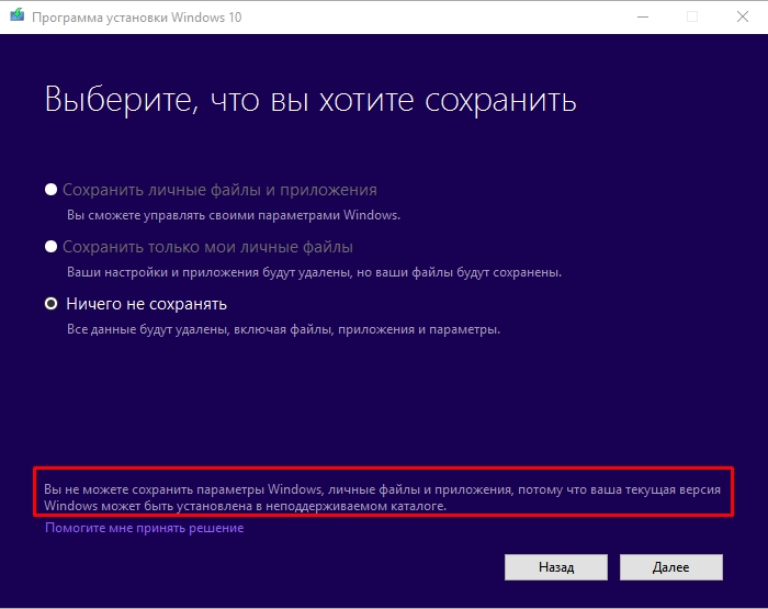 Вы не можете сохранить параметры Windows, личные файлы и приложения, потому что ваша текущая версия Windows может быть установлена в неподдерживаемом каталоге. Как исправить ?