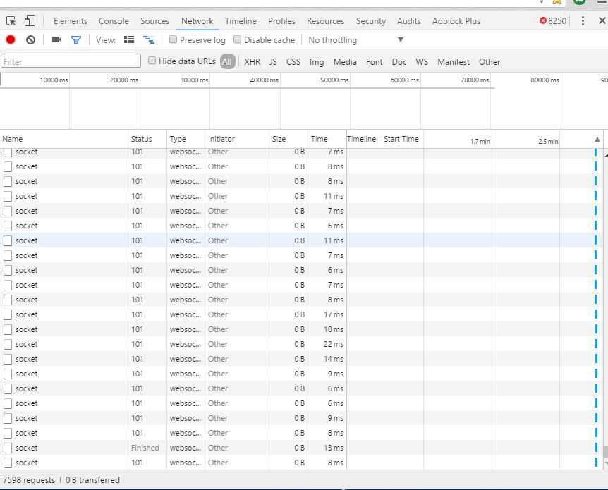 Здравствуйте. У нас есть свой сервер, на котором размещается сервер (Open Source) для обработки данных трекеров (устройство для мониторинга передвижения ТС) и веб-клиент, который отображает эти данные. У самого сервера, кроме нашего, есть свой фронтэнд. Когда я его открываю, у меня сразу начинают генерироваться вебсокеты каждые 5-7мс. Это видно на скринах. Соль в том, что такое поведение наблюдается только у меня (со всей нашей команды), и только на Виндовс. На Убунту я такого не наблюдаю. На прошлых выходных я решился переустановить Виндовс и проблема исчезла. Вчера опять это появилось. Перезагрузился в безопасный режим с поддержкой сетевых драйверов, открыл сервер и нет никаких вебсокетов. В службах и процессах не обнаружил ничего подозрительного.