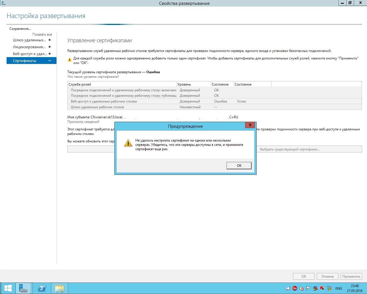 при развертывании доменного сертификата pfx для веб-доступ к удаленным рабочим столам возникает ошибка: убедитесь, что эти серверы доступны в сети и примените сертификат еще раз.