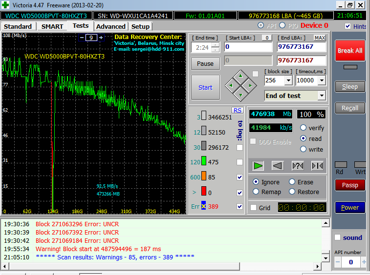 СМАРТ (с помощью Виктории) дал следующие результаты: WDC WD5000BPVT-80HXZT3 WD-WXU1CA1A4241 ------------------------------------------------------------------------- ID Name Value Worst Tresh Raw Health ------------------------------------------------------------------------- 1 Raw read error rate 199 199 51 28483 ••••• 3 Spin-up time 177 172 21 2108 ••••• 4 Number of spin-up times 80 80 0 20526 •••• 5 Reallocated sector count 200 200 140 0 ••••• 7 Seek error rate 200 200 0 0 ••••• 9 Power-on time 85 85 0 11333 •••• 10 Spin-up retries 100 100 0 0 ••••• 11 Recalibration retries 100 100 0 0 ••••• 12 Start/stop count 97 97 0 3890 •••• 191 G-SENSOR shock counter 1 1 0 1619 • 192 Power-off retract count 200 200 0 65 ••••• 193 Load/unload cycle count 1 1 0 1070155 • 194 HDA Temperature 107 99 0 40°C/104°F •••• 196 Reallocated event count 200 200 0 0 ••••• 197 Current pending sectors 196 196 0 389 ••••• 198 Offline scan UNC sectors 100 253 0 0 ••••• 199 Ultra DMA CRC errors 200 200 0 0 ••••• 200 Multi zone error rate 100 253 0 0 ••••• Правильно ли я интерпретировал данные, или упустил еще что-то важное для этой ситуации? Какие варианты кроме покупки нового диска? Добавляю "фотоотчет" тестов Victoria. http://forum.oszone.net/attachment.p...1&d=1469383951 |
