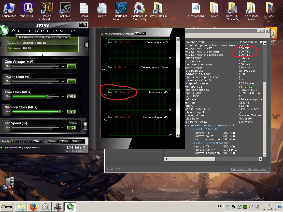 Собственно видеокарта Palit 9800 GT работает на очень низких частотах, даже когда включаю игры частоты не меняются из за этого играть во что либо просто невозможно, так же не работает способ разгона MSI Afterburner, я не сильно шарю в железе но разгон делал по инструкции в интернете, версия видео драйвера последняя 341,98, тесты в Бенчмарке тоже показывают Дефолтную частоту в 300 МГЦ и она не растет. Помогите пожалуйста