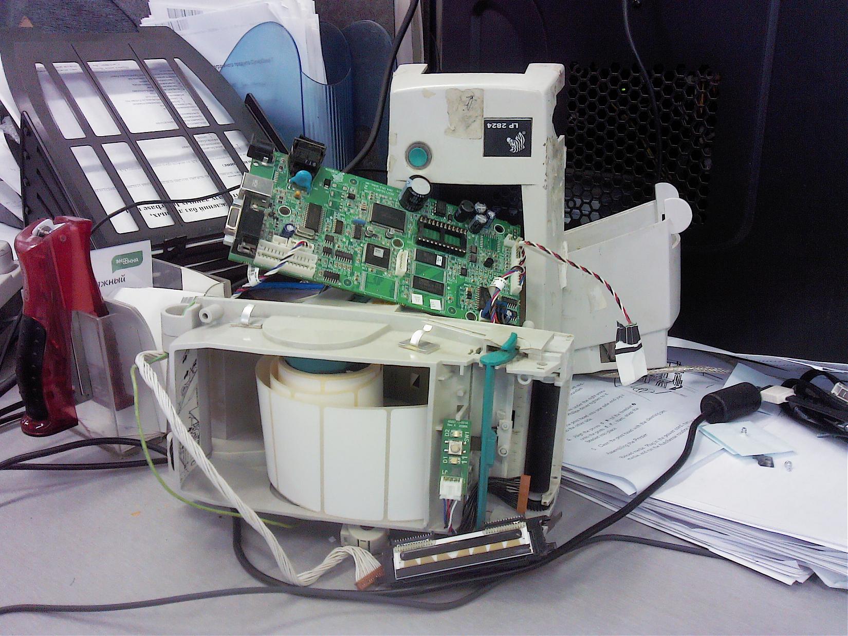 Мы продолжаем задавать каверзные вопросы :) ---- Предыстория: Достался в руки на диагностику Zebra LP2824 Принтер в целом печатает. Только есть пару но. Драйвера установлены, Windows 7 64x. Первоначально были подозрения на печатающую голову. Сейчас в наличии есть и "условно больная" и "новая здоровая". В конечном итоге удалось разобрать принтер и долезть до платы управления (принтер видал виды и корпус был насмерть заклеен (ха-ха-ха! :) ) Подключение по usb. По идее он может и RS232, но не проверял (знаю где лежит переходник с ПК USB -> RS232, но он пока не доступен) Залепив пару датчиков заставил его работать с открытом корпусом "для чистоты эксперимента". ---- Теперь собственно сама суть: Отдаю ему печать конфигурации, рисует черные полосы. Чуть-чуть мну плату (хотя можно просто провода пошебуршить) и он ту же конфигурацию уже печатает белым, с тонкими черными полосочками. Прикладываю фотографию нарезанных этикеток. ---- Вопрос: Это то, о чем я думаю - повреждение платы контроллера или принтер еще можно спасти "малой кровью"? Если кровь, то какая и сколько? :) |