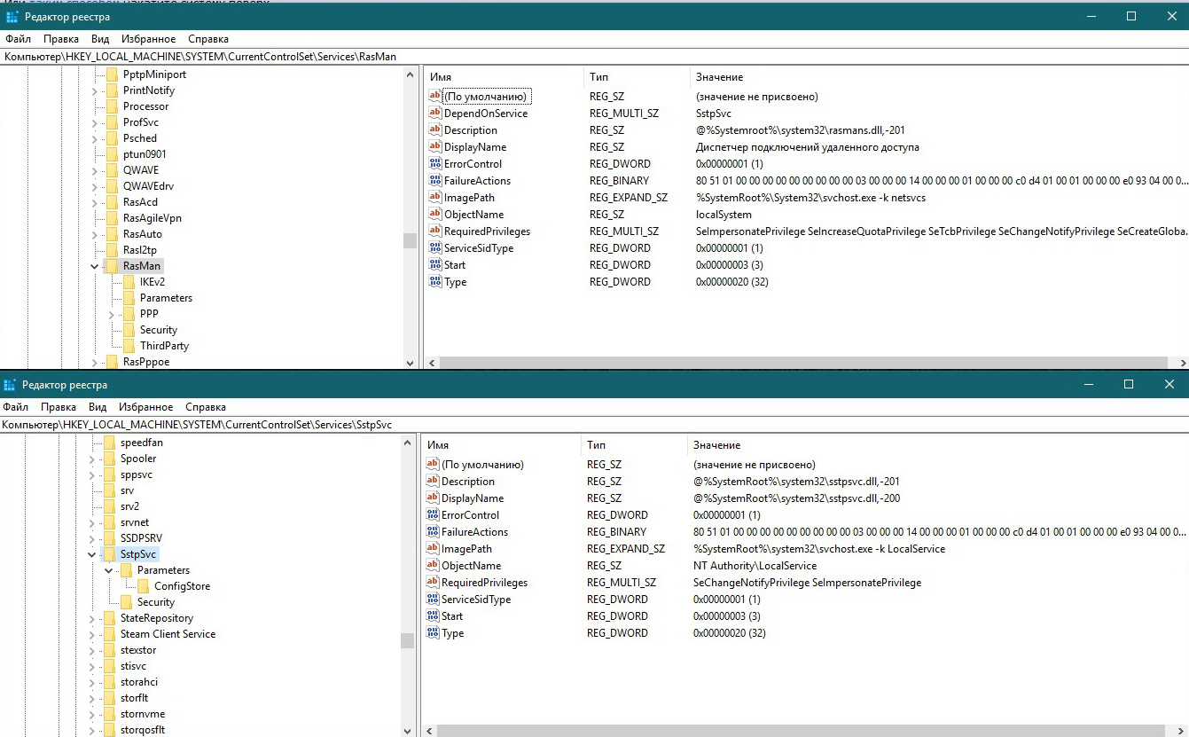 Сделайте скриншоты разделов реестра: HKEY_LOCAL_MACHINE\SYSTEM\CurrentControlSet\services\RasMan HKEY_LOCAL_MACHINE\SYSTEM\CurrentControlSet\services\SstpSvc В Просмотре событий > ПКМ на журналах Приложение и Система > Сохранить все события как... > файлы вложите в архив и подкрепите к сообщению. Сохраняйте в формате, который сохраняется по умолчанию. |