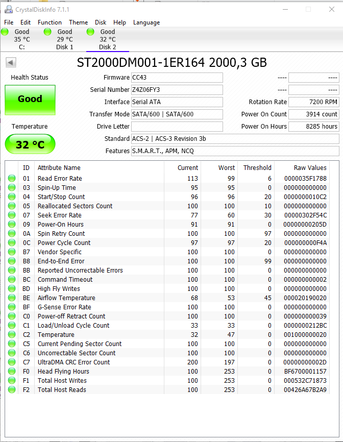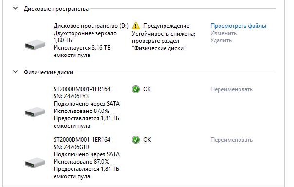 Имеется зеркало из двух одинаковых жестких дисков. Зеркало программное, сделано средствами Windows 10. Операционная система установлена на отдельном SSD. Проблема: Иногда бывает так, что компьютер грузится до момента загрузки ОС, после чего загрузка становится "вечной". На экране лого Windows10, внизу крутится индикатор загрузи и все. Иногда громко щёлкает какой-то диск. Отключаю оба диска (SATA-кабель) - Windows загружается и все работает как положено. Начинаю отключать по одному - Windows тоже загружается как положено, диски не щёлкают. Т.е. неисправность плавающая. Короче отследить кто именно щёлкает не могу, потому что как только выключаю ПК, неисправность пропадает. Полез смотреть логи винды - там есть много подобных предупреждений: "Обнаружена ошибка на устройстве \Device\Harddisk1\DR1 во время выполнения операции страничного обмена." "Операция ввода-вывода по адресу логического блока 0xf62cf08 для диска 1 (имя PDO: \Device\0000003d) выполнена повторно." "Операция ввода-вывода по адресу логического блока 0xaf800 для диска 1 (имя PDO: \Device\0000003d) выполнена повторно." "Операция ввода-вывода по адресу логического блока 0x381040 для диска 2 (имя PDO: \Device\0000003e) выполнена повторно." "Операция ввода-вывода по адресу логического блока 0x8c325a38 для диска 2 (имя PDO: \Device\0000003e) выполнена повторно." Посмотрел SMART дисков - вроде ничего криминального. Иногда (очень иногда), в разделе "физические диски" Windows выдает предупреждение "Проверьте жесткий диск". Короче неисправность плавающая, а виновника поймать не могу. Как продиагностировать жесткие диски и понять - какой из них умирает? Скриншоты SMART и единственного предупреждения винды прикладываю. p.s. Первым делом поменял все SATA-кабели. |