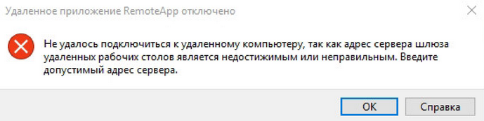Здравствуйте! Помогите решить проблему. Есть один компьютер с Windows 10 x64 1607 (14393.2007). Не могу подключиться к серверу терминалов по RemoteApp. Через RDP mstsc.exe всё отлично подключается, а через RemoteApp пишет ошибку. "Не удалось подключиться к удаленному компьютеру так как адрес сервера шлюза удаленных рабочих столов является недостижимым. Введите допустимый адрес сервера". Куда копать? Что нужно поправить? Другой компьютер с Windows 10 x64 1709 (FCU) нормально подключается через RemoteApp. Может это связано с обновлением Windows?