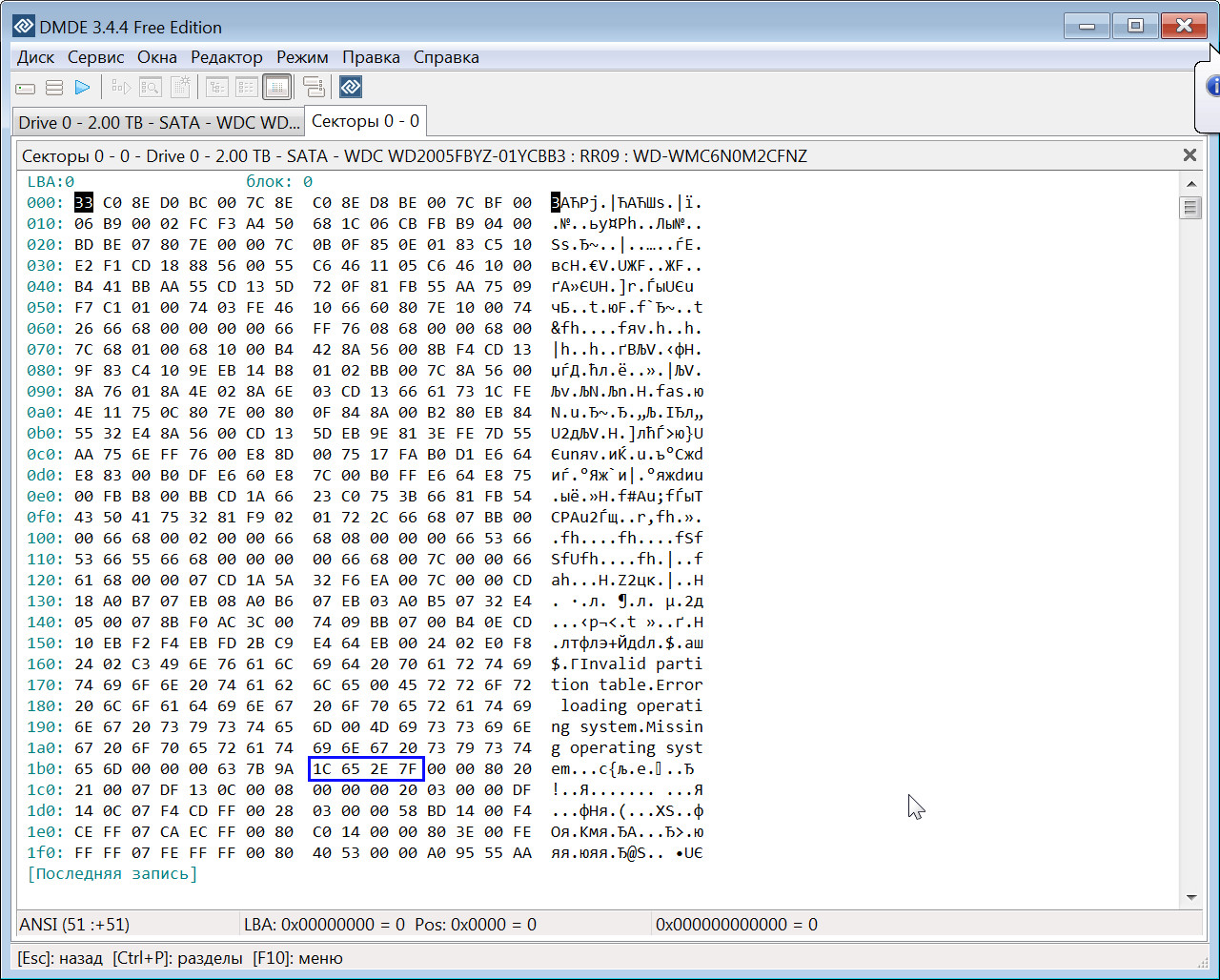 См. Загрузка - bootrec /fixboot отказано в доступе В DMDE надо будет показать окно Разделы диска... для каждого физического носителя. А также нижнее окно, которое окно с разделами диска прикрывает. --- Сразу два окна выводятся. Так верхнее надо сдвинуть в сторону. См. картинку 1 Ну и дамп LBA:0 посмотреть в меню Редактор ===> Физические секторы ===> Перейти к сектору 0. Последний сектор 0. --- Пока один этот сектор смотрим. Но можно и больше посмотреть... См картинку 2 Сигнатуры на картинках 1 и 2 совпадают. Просто это число --- двойное слово в Litle-endian и его надо читать в "обратный зад..." ЗЫ У меня нет UEFI и GPT... Но у Вас будет нечто подобное. А в дампе LBA:O по смещению 01B8h будет точно Windows NT сигнатура. Цитата 9285-311: