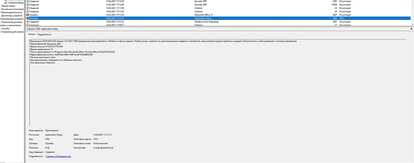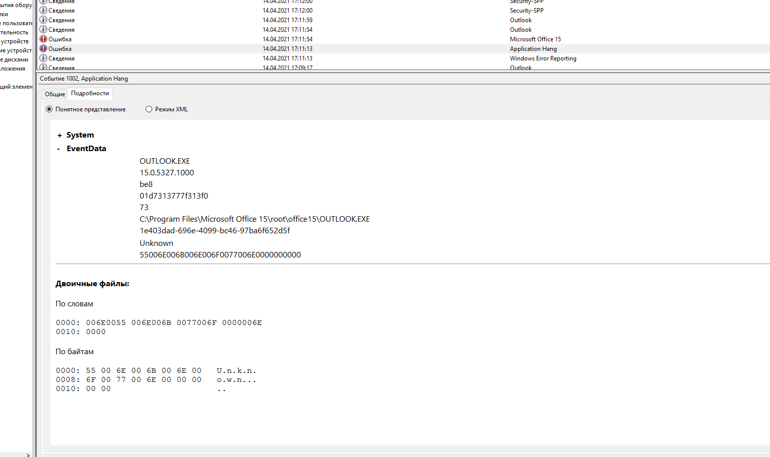 Сталкнулся с такой проблемой что при поиске определенных сообщений (с указанием конкретных эл.ящиков) outlook повисает намертво! (Но если отключить службу индексации для outlook? то все становиться нормально) Ниже прилагаю логи и всякое (Пробовал править файл пользователя, + пробовал на чистой машине + пробовал переиндексировать ящик) |