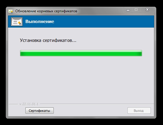 У меня тоже самое (как и у вас) с последним Набором - Обновление корневых сертификатов v.22.11.1.1. Зависание именно на установке Российских сертификатов, при установке остальных - все нормально. Набор - Обновление корневых сертификатов, если использовать версию 22.10.14 - все нормально устанавливается. Так, что вы не одиноки. |
