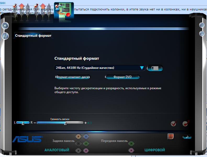 Профиль | Отправить PM | Цитировать Можно для начала откатиться к контрольной точке. Это я сделал в первую очередь, но увы не пролезло, в микшере звука индикатор прыгает видно что звук идёт, но почему то не доходит до наушников и ещё диспетчер звука у материнки ASUS для меня не понятный.