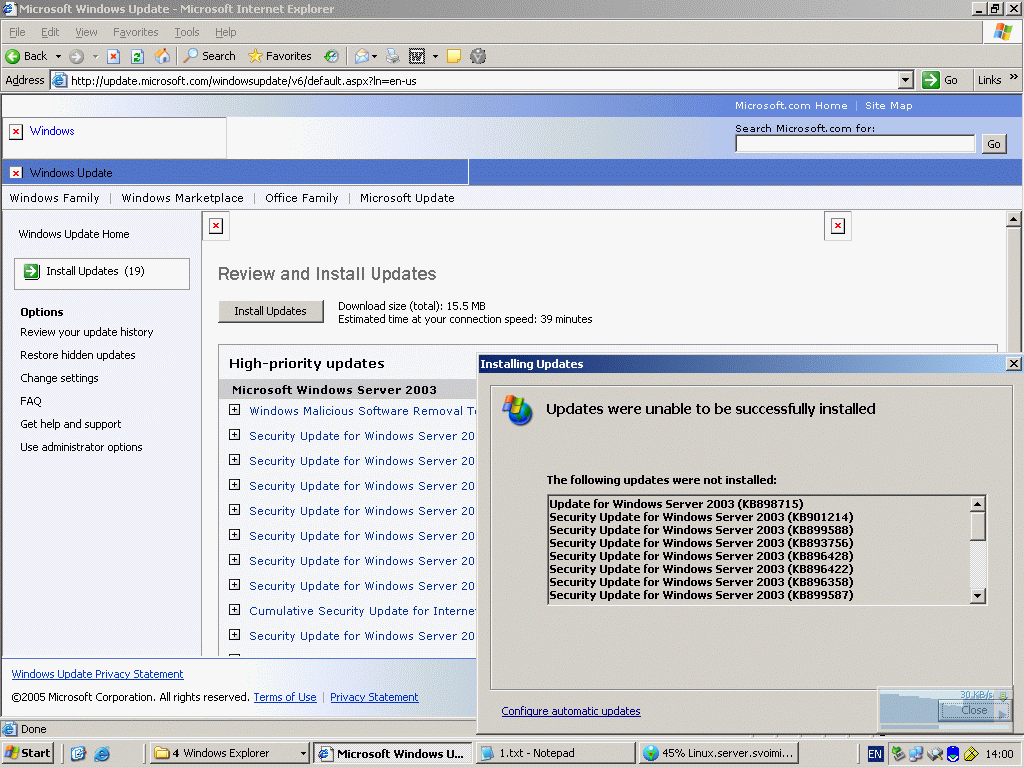 Установили инет-шлюз : FreeBSD + Squid. Перестали закачиваться обновления Windows. В Squid адрес update.windows.com разрешен, да и открываются все страницы диалога, но операция заканчивается неудачей. То же на всех клиентах WinXP, w2k. Копия экрана прилагается. Подскажите, плз, где копать. Спасибо за помощь. |