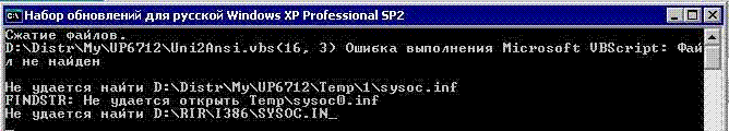 Профиль | Отправить PM | Цитировать скачал UpdatePack 6.7.12, в числе аддонов - драйверпак, при интеграции в обычный дистрибутив - все OK, а вот как только дело касается ris дистрибутива появляется сообщение "файл UNI2ANSI.VBS не найден; файл sysoc.ini не найден" подскажите пожалуйста где копать. К сообщению прикреплен скриншот с результатом попытки. Заранее спасибо.