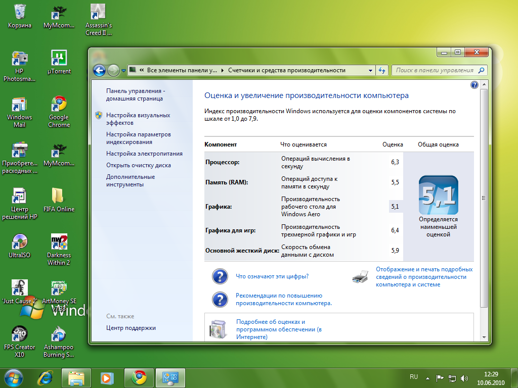 ) индексами производительности системы .Указывайте конфигурацию компьютера, а именно: