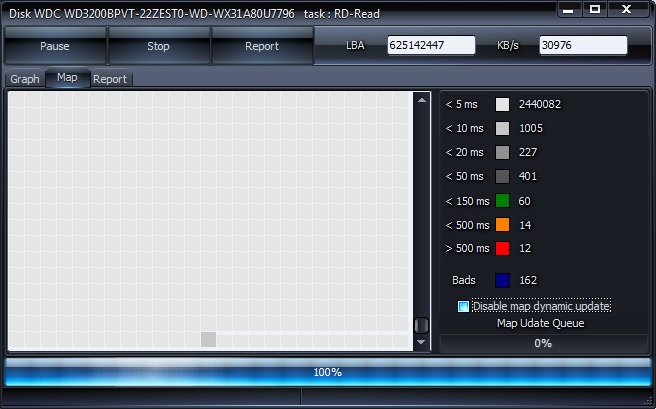 Tau_0 Просканировал Викторией 4.47 после теста в режиме линейной записи - Erase прогой HDDScan 3.3 . Бэдов 22 было 165. В основном это новые бэды - 2 в самом начале, после 60% с небольшим их вроде вообще не было. Что посоветуешь, сделать запись еще раз в HDDScan или ..., хотелось бы закончить лечение из под Винды ??? ЗЫ С утра бук не увидел диск, пришлось форматировать. Перешел в тему Низкая скорость винчестера . |