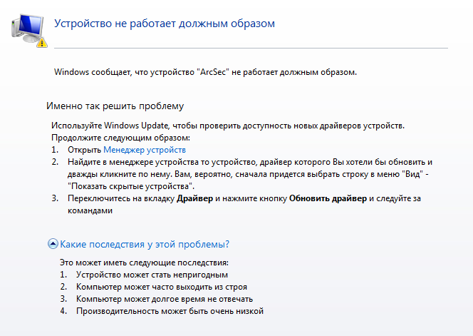 Сбой при загрузке драйвера(ов) перезагрузки или запуска системы: ArcSec И TuneUp пишет, что устройство "ArcSec" не работает должным образом. Подробнее-см. на скринах. Поясните, пожалуйста, что это за устройство-"ArcSec" и где взять на него драйвер? ОС-Windows 7 x64. Заранее благодарю всех, кто откликнется. |