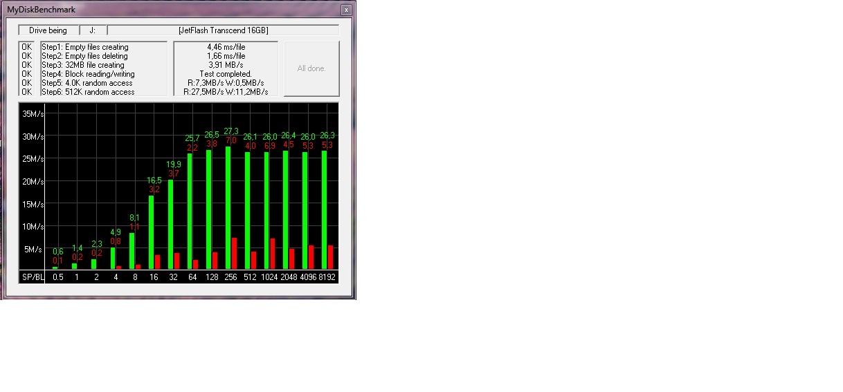 ----------------------------------------------------------------------- CrystalDiskMark 3.0.1 (C) 2007-2010 hiyohiyo Crystal Dew World : http://crystalmark.info/ ----------------------------------------------------------------------- * MB/s = 1,000,000 byte/s [SATA/300 = 300,000,000 byte/s] Sequential Read : 13.921 MB/s Sequential Write : 6.860 MB/s Random Read 512KB : 15.873 MB/s Random Write 512KB : 0.641 MB/s Random Read 4KB (QD=1) : 3.542 MB/s [ 864.7 IOPS] Random Write 4KB (QD=1) : 0.006 MB/s [ 1.5 IOPS] Random Read 4KB (QD=32) : 3.611 MB/s [ 881.6 IOPS] Random Write 4KB (QD=32) : 0.006 MB/s [ 1.6 IOPS] Test : 500 MB [E: 0.0% (0.0/3856.4 MB)] (x5) Date : 2011/03/26 12:12:03 OS : Windows Vista Home Premium Edition SP1 [6.0 Build 6001] (x86) Transcend JetFlash 600 (32Gb) ----------------------------------------------------------------------- CrystalDiskMark 3.0.1 (C) 2007-2010 hiyohiyo Crystal Dew World : http://crystalmark.info/ ----------------------------------------------------------------------- * MB/s = 1,000,000 byte/s [SATA/300 = 300,000,000 byte/s] Sequential Read : 31.408 MB/s Sequential Write : 12.833 MB/s Random Read 512KB : 30.735 MB/s Random Write 512KB : 1.090 MB/s Random Read 4KB (QD=1) : 3.752 MB/s [ 916.1 IOPS] Random Write 4KB (QD=1) : 0.010 MB/s [ 2.5 IOPS] Random Read 4KB (QD=32) : 3.898 MB/s [ 951.7 IOPS] Random Write 4KB (QD=32) : 0.012 MB/s [ 3.0 IOPS] Test : 500 MB [E: 0.0% (0.0/29.9 GB)] (x5) Date : 2011/03/26 12:45:03 OS : Windows Vista Home Premium Edition SP1 [6.0 Build 6001] (x86) |