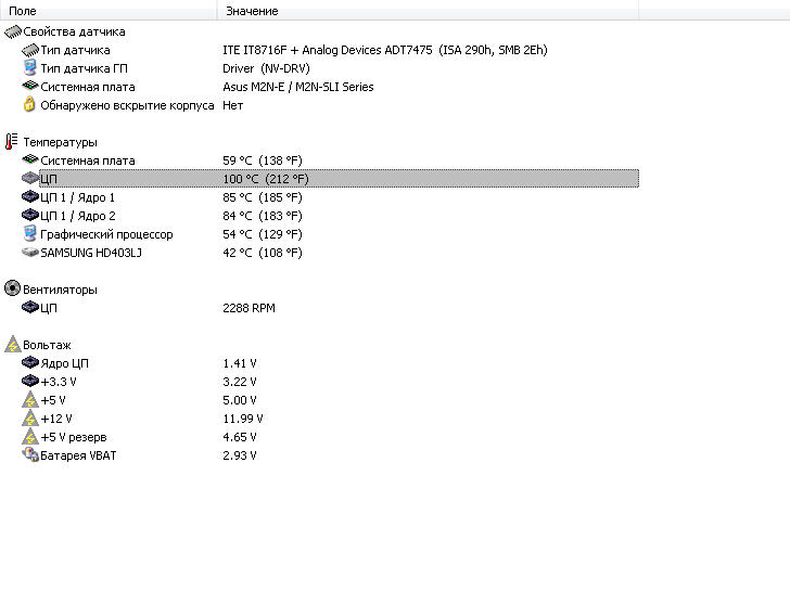 Свойства датчика: Тип датчика Winbond W83697HF (ISA 290h) Системная плата ASRock P4V88 / P4VM8 / P4VM800 Температуры: Системная плата 37 °C (99 °F) ЦП 56 °C (133 °F) SAMSUNG SP1203N 35 °C (95 °F) Вентиляторы: ЦП 3245 RPM Вольтаж: Ядро ЦП 1.38 V +3.3 V 3.10 V +5 V 5.16 V +12 V 12.01 V +5 V резерв 4.80 V ---------------------------------------------------------------- Такая температура после часа работы. Это нормально???? Свойства ЦП: Тип ЦП Intel Pentium 4, 3000 MHz (15 x 200) Псевдоним ЦП Prescott |