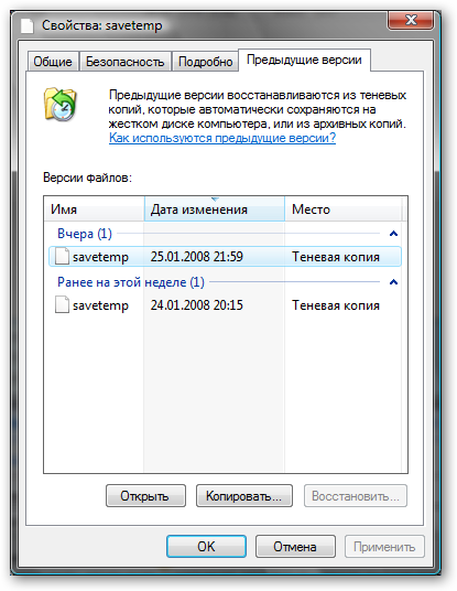 ![]() в висте есть возможность открывать например документы предыдущих версий, то есть это возможность восстановить измененный файл, вытянув его из теневой копии. |
